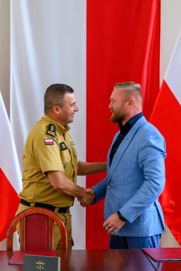 Umowę podpisali: st. bryg. Tomasz Baran, podkarpacki komendant wojewódzki PSP w Rzeszowie oraz Krystian Woś, prezes zarządu firmy TEXOM, która jest wykonawcą inwestycji.