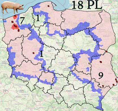Lokalizację ognisk choroby i wyznaczone strefy w Polsce zobrazowano na stronie https://bip.wetgiw.gov.pl/asf/mapa.